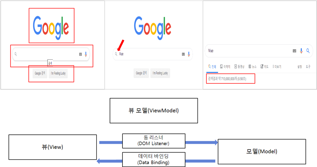 - ViewModel은 검색버튼을 감지후 Model에서 Vue에 해당하는 데이터를 가져오는 로직(돔 리스너)을 실행합니다