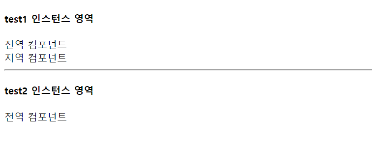 - 전역 컴포넌트는 한 번 등록하면 어느 인스턴스 영역에서든 사용할 수 있습니다.