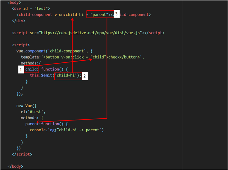 4. (html) v-on:child-hi[이벤트 수신] = "parent"[메서드 실행]